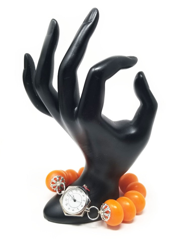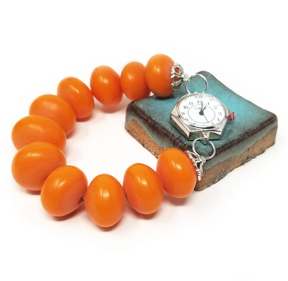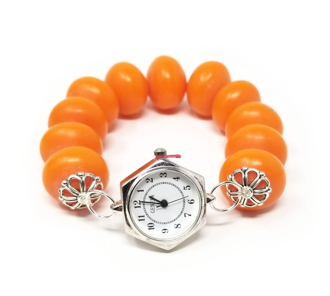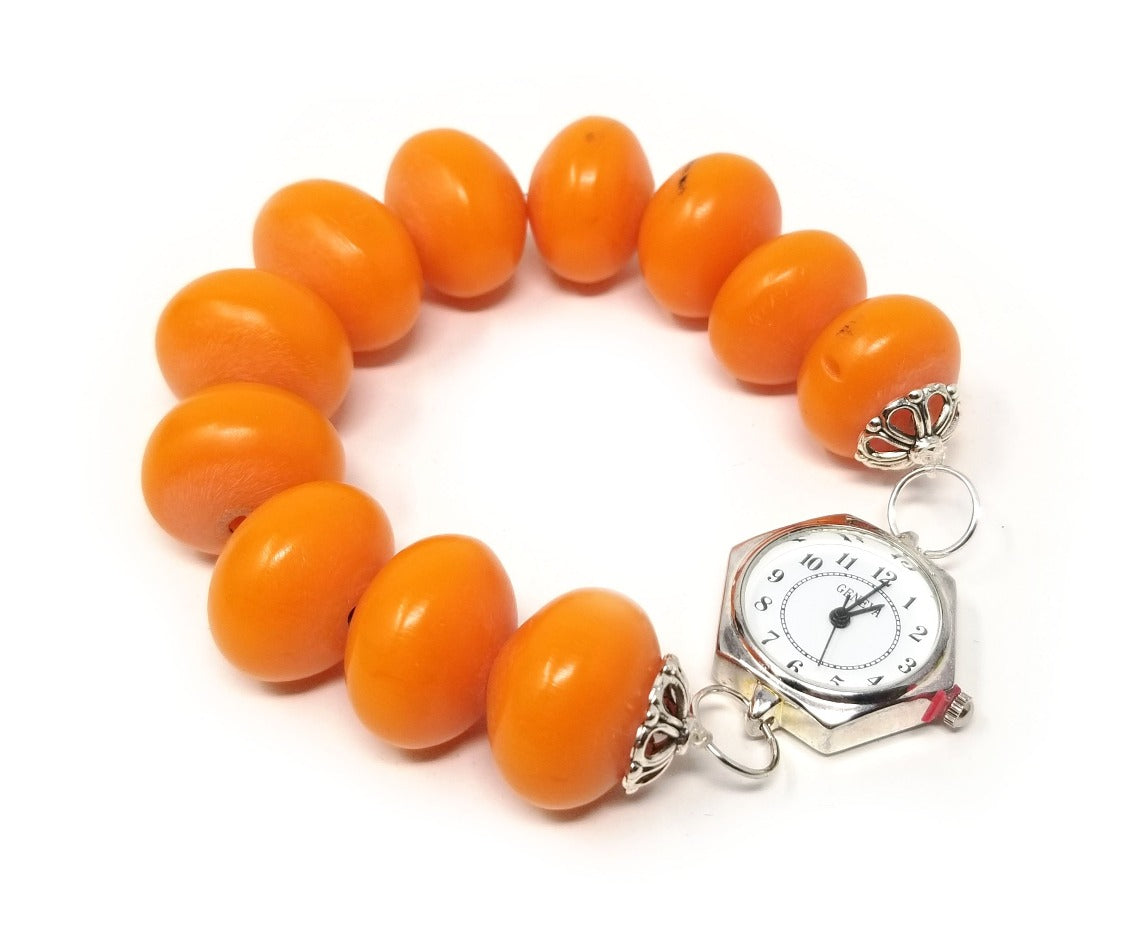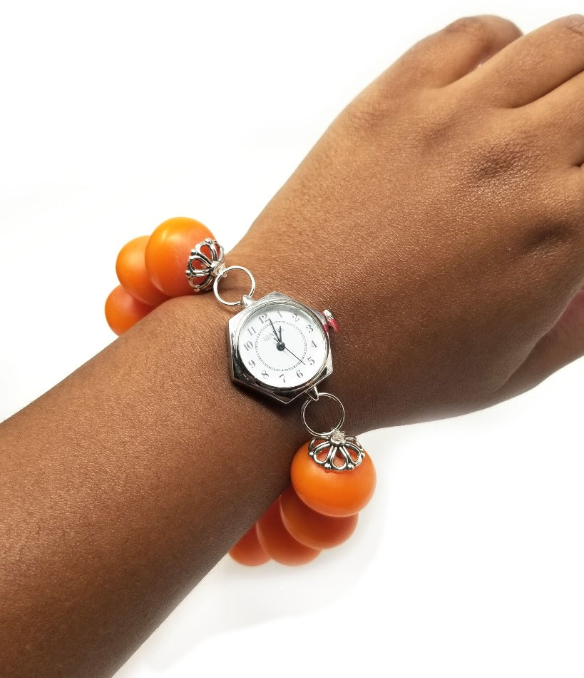 Beautifully bright African amber beads form this simplistic yet eye-catching beaded watch. The bright orange beads form a single stretch to fit strand, with two silver accents capping it off at each end, creating a quiet touch of luxury that's easy to wear. A unique hexagon shaped silver watch face completes the look, making this one of a kind watch for women sure to pop off your wrist and grab attention!