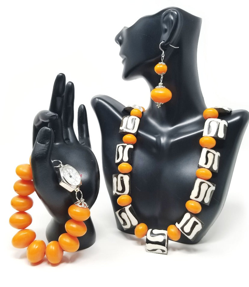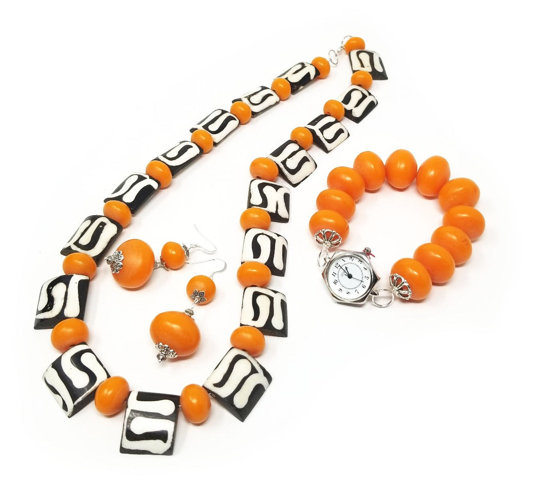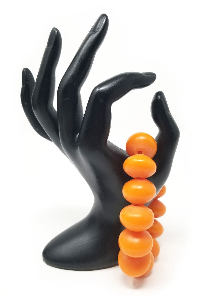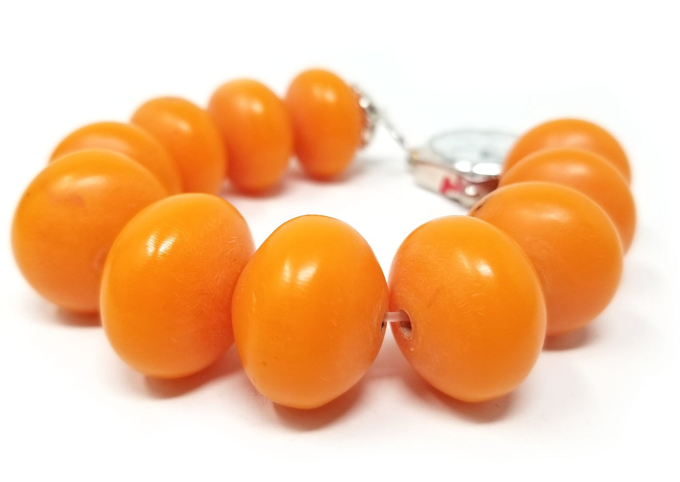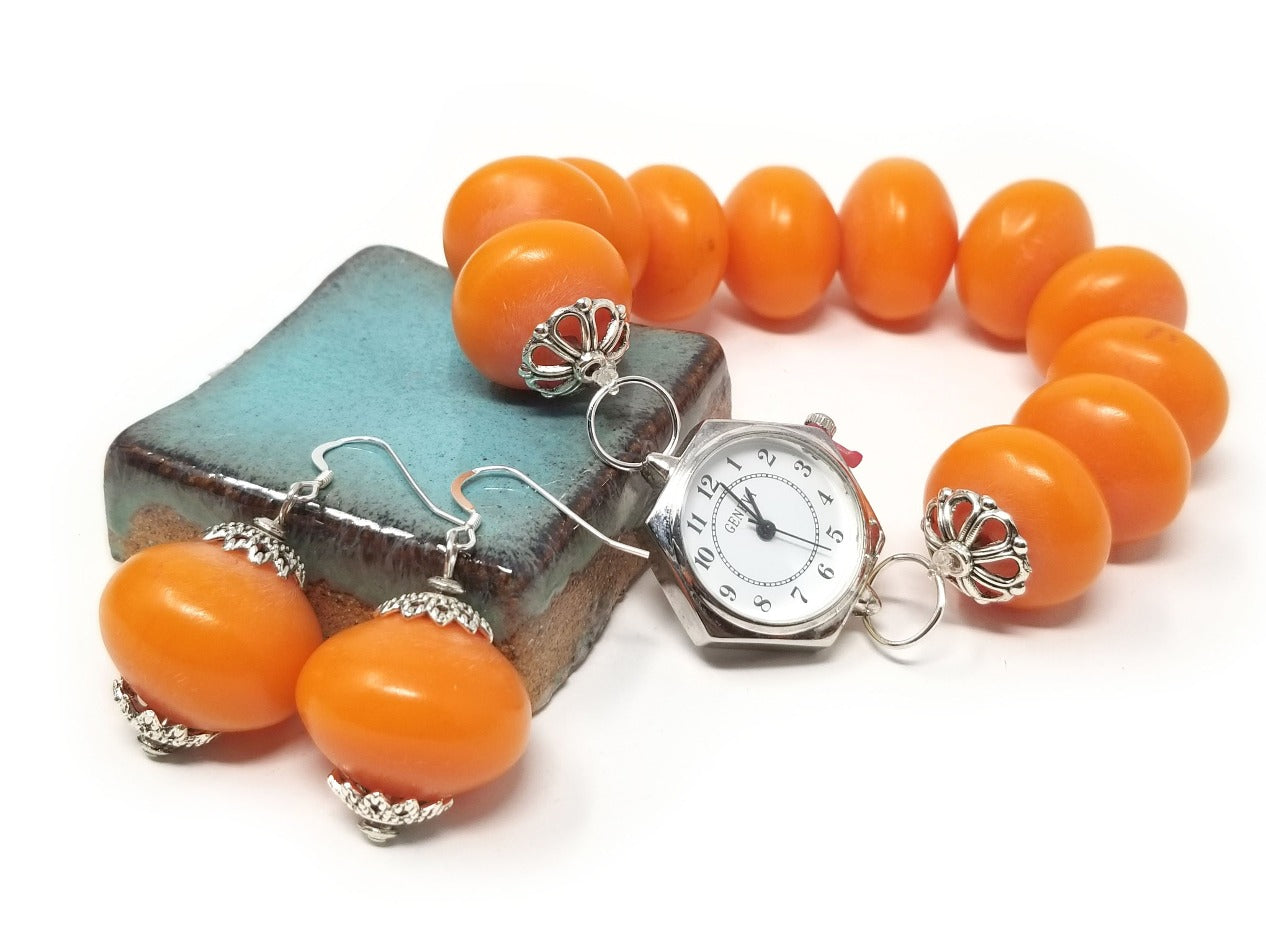 Beautifully bright African amber beads form this simplistic yet eye-catching beaded watch. The bright orange beads form a single stretch to fit strand, with two silver accents capping it off at each end, creating a quiet touch of luxury that's easy to wear. A unique hexagon shaped silver watch face completes the look, making this one of a kind watch for women sure to pop off your wrist and grab attention!